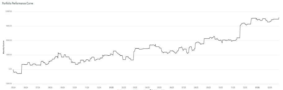 I trade this strategy as one component of a broader portfolio on a larger account, allocating only a specific portion of my capital to it. Because I use slightly modified risk parameters for my own setup, my personal live equity curve follows the exact same trajectory as the simulation, with only minor variations in the day-to-day details.