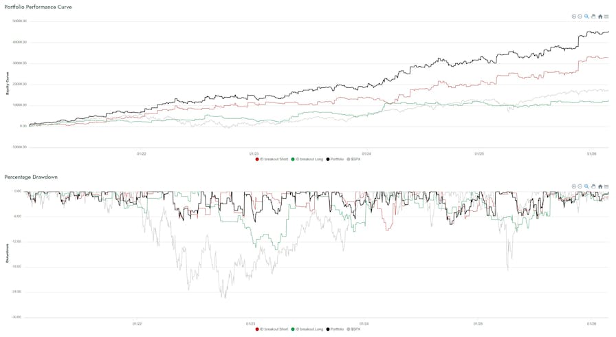 Notice how the breakout strategy effortlessly keeps pace with the broader index, yet only ties up your capital on specific, high-probability days. Because your money isn't constantly exposed to the market, this system acts as the ideal diversifier to run alongside your existing trading portfolio.